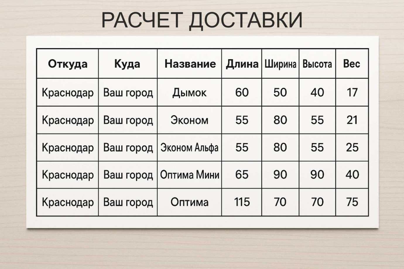Доставка оплачивается отдельно - средняя стоимость доставки примерно 3000 рублей. Для точного расчета воспользуйтесь "Калькулятором", для заполнения используйте данные из таблицы